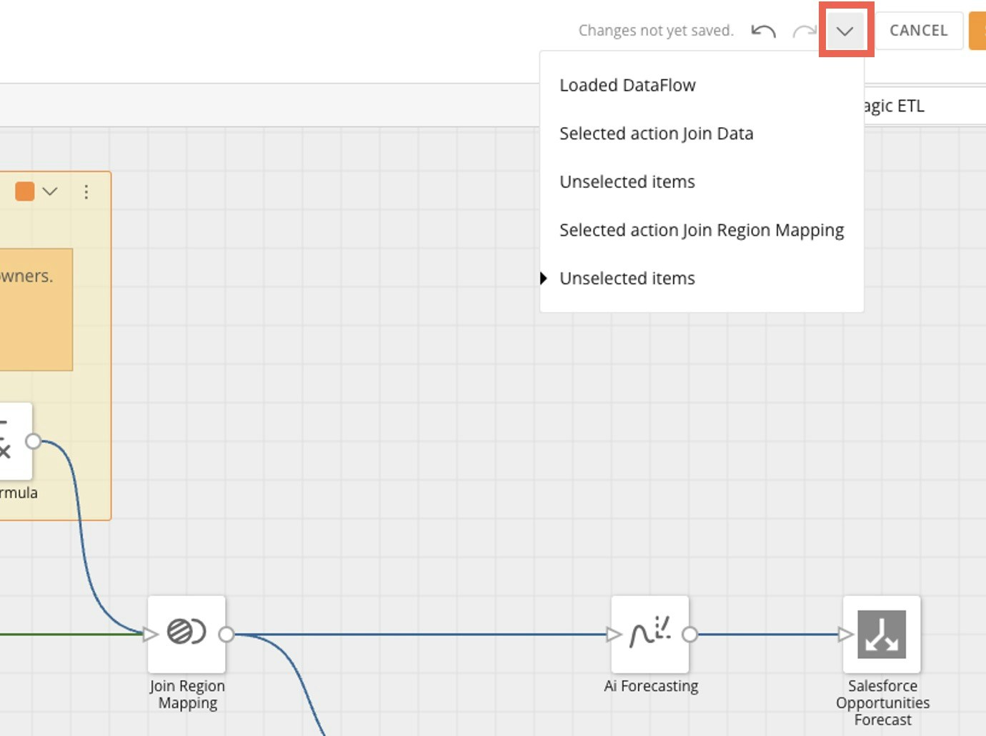 You can also use the dropdown to view an action history list of all actions taken during a given editing session. Using the list, you can jump forward and backward in time to see the DataFlow in that state.