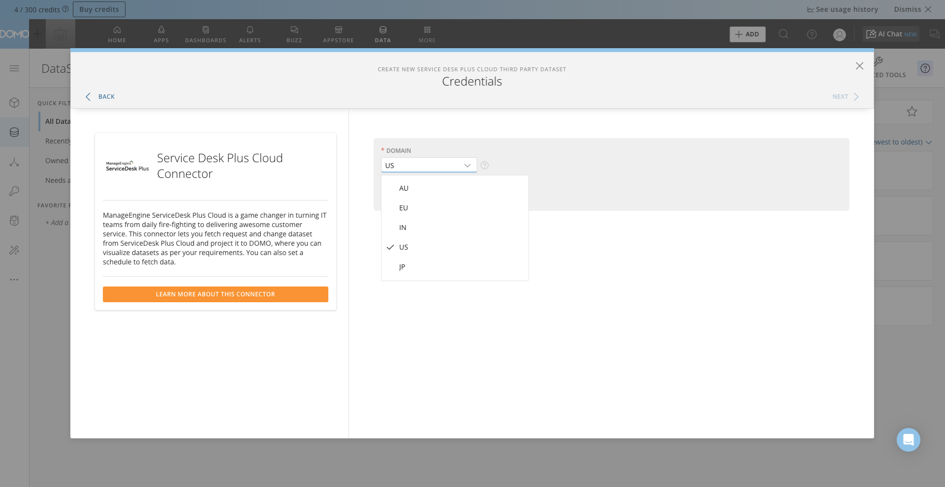 This section enumerates the options in the Credentials and Details panes on the ServiceDesk Plus Connector page. This connector uses OAuth to connect, so you don’t have to enter credentials within Domo.- After logging into Domo, navigate to Connectors and search for the SDP Cloud Connector.