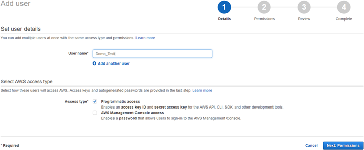 You must create a user with the proper permissions in the IAM Amazon Console before you can connect to S3 data in Domo. To configure your user in the IAM Amazon Console,-
