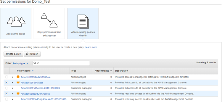 In the Permissions pane, select Attach existing policies directly, then check the box for either AmazonS3FullAccess or AmazonS3ReadOnlyAccess. Customer-managed policies do not work.