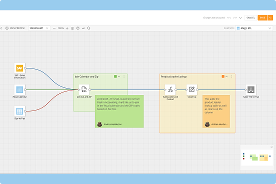 Visually map out and connect every step of your data’s journey. Chain together multiple transformations and actions in an intuitive drag-and-drop interface to build complex pipelines without code. Use built-in sections and notes to document your logic, then extend an intuitive, drag-and-drop experience to business users, all within one governed environment that you oversee.