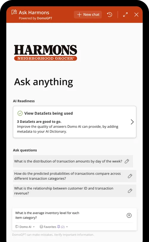Domo.AIは、ChatGPTなどの生成AIとビジネスデータを統合し、日常業務を革新する“AIエージェント”を実現。業務の自動化から傾向分析、将来予測までをAIが代行。人の判断力とスピードを最大化し、モデル管理の効率化と組織全体の意思決定力を飛躍的に向上させます。データの可能性を“行動”に変えるDomo.AIが、目覚ましいビジネス成長を後押しします。