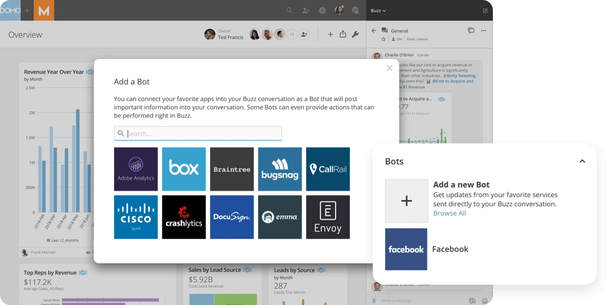 テキストBotに、データに関する質問を自然言語で投げかけると、すぐに回答を得ることができます。テキストBotはDomo内で誰でも利用でき、Adobe Analytics、Google Analytics、Shopifyなどのごく一般的なデータセットをDomoに取り込んで、そのデータをテキストBotで利用できます。 標準以外のカスタムBotを追加して、一般的でないその他のシステムやAPI経由でのデータセットも利用することもできます。