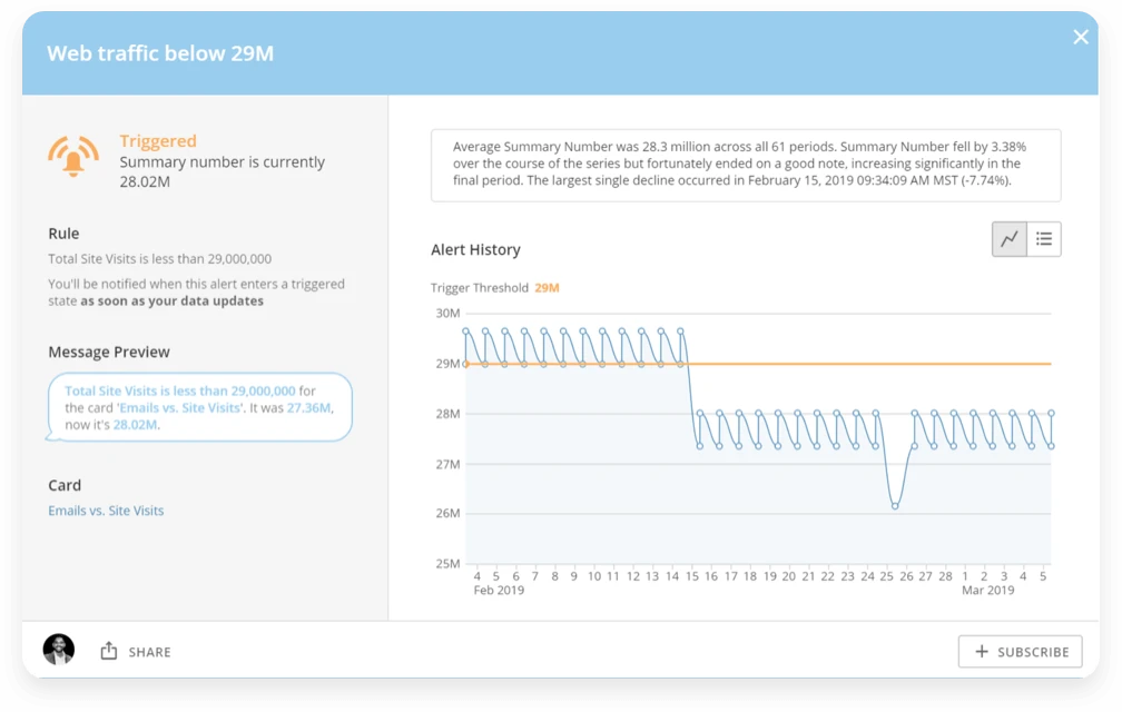 KPIが変化したときにアラートを受け取ることができます。KPIが特定のしきい値を上回るか下回ったときに通知を送る独自のカスタムアラートを作成しておくと、コンピューターやスマートフォンに通知が送られます。アラートルールをカスタマイズして、通知の頻度、アラートメッセージの内容、通知の送信先を指定できます。