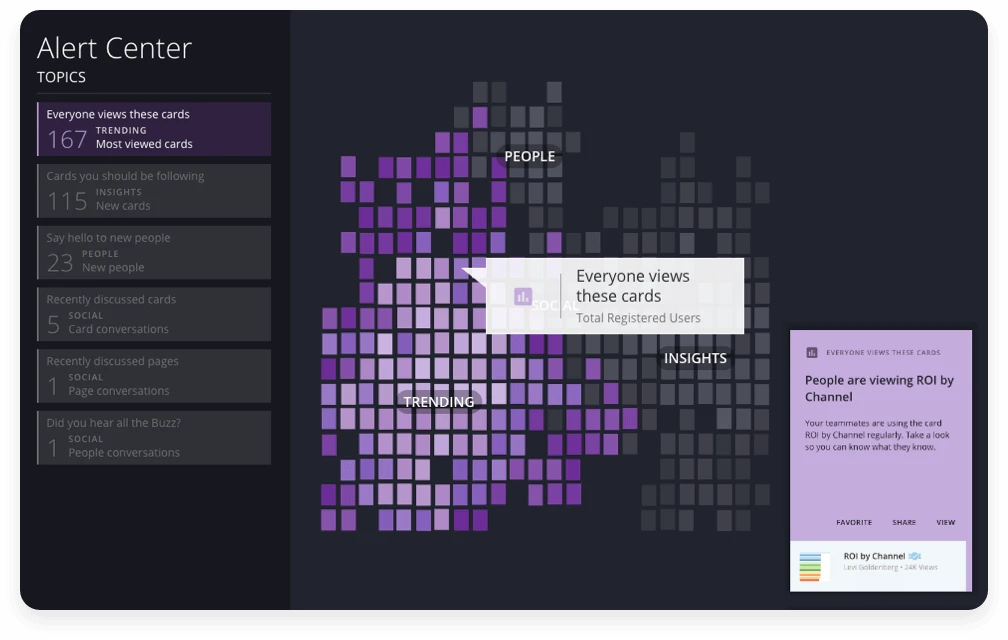 Domoアラートセンターでは、作成されたコンテンツの内容、変更の内容、さらにチームが現在取り組んでいる指標、ディスカッション、アラートを一括して把握できます。気になるインサイトがある場合、アラートセンターから該当するディスカッション、チャート、ダッシュボードに直接アクセスして、すぐにそのインサイトを活用できます。