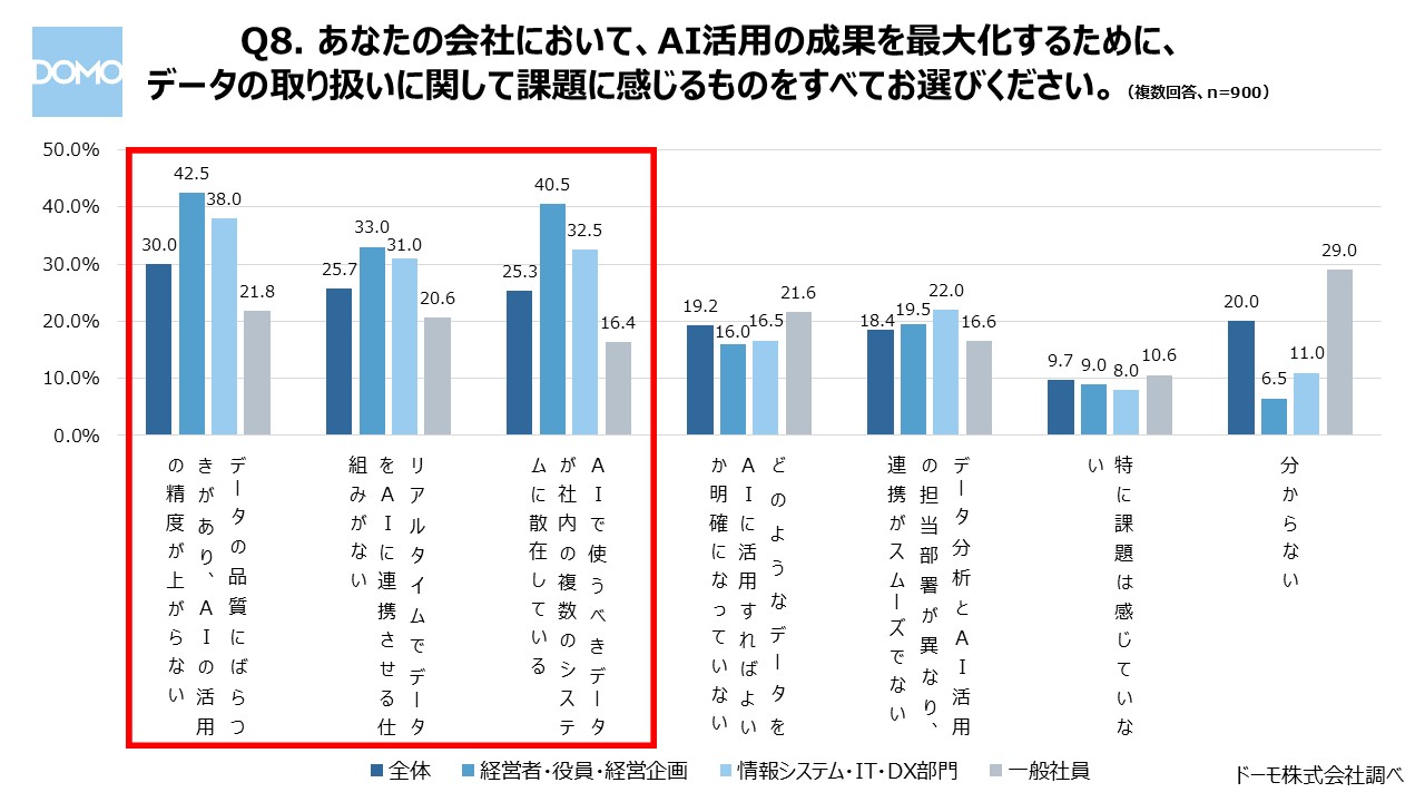 AIを搭載した全社データ活用プラットフォーム「Domo」を提供するドーモ株式会社(本社:東京都千代田区、プレジデント ジャパンカントリーマネージャー:川崎友和、以下ドーモ)は、全国の従業員数300名以上の中堅・大手企業でAIを導入している企業に勤める経営者・役員・経営企画200名、情報システム・IT・DX部門200名、一般社員500名の計900名を対象に、「日本企業のAIとデータ活用の実態調査」を実施しました。