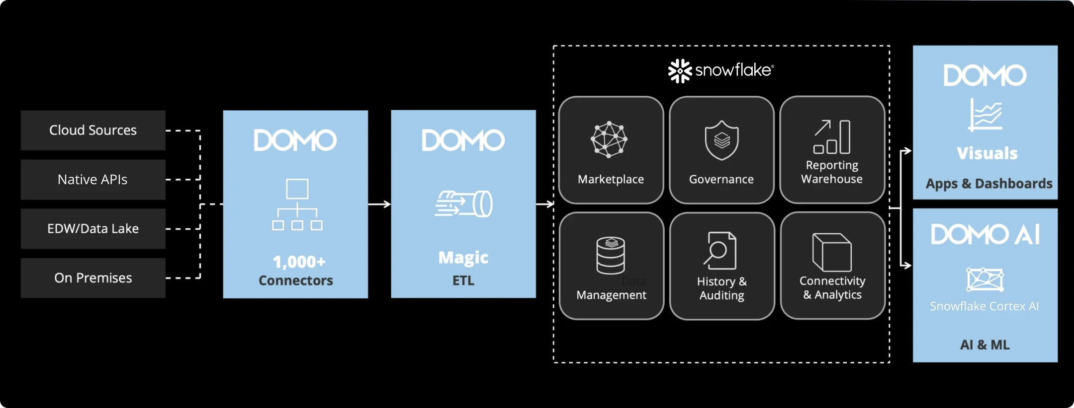 レポート、ソーシャルメディア、スプレッドシートなど、あらゆるソースと接続可能。 Snowflake のセキュリティと Domo の管理性を組み合わせ、すべてのデータを安全に統合します。