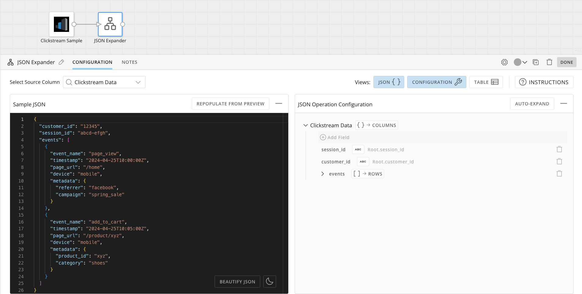 Now, there’s a better way. The JSON Expander Tile transforms how you access and work with JSON-formatted data by breaking it down into a navigable, hierarchical structure. This enables you to expand it from a single column into multiple columns, without the need for complicated parsing.